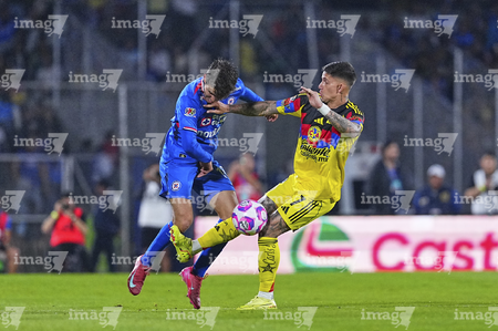 Ciudad de México, 18 de octubre de 2025. Lorenzo Faravelli y José Paradela, durante el partido correspondiente a la jornada 13 del torneo Apertura 2025 de la Liga BBVA MX, entre la Máquina Celeste del Cruz Azul y las Águilas del América, realizado en el estadio Olímpico Universitario. Foto: Imago7/