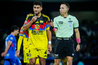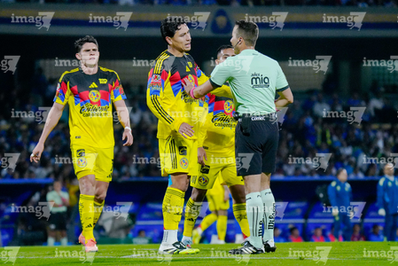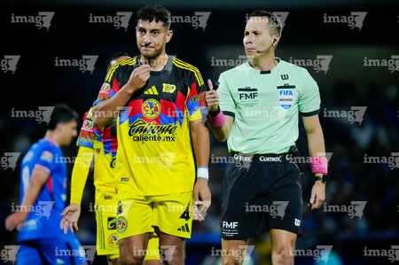 Ciudad de México, 18 de octubre de 2025. Sebastián Cáceres en reclamo a Rfael López Valle, árbitro central, durante el partido correspondiente a la jornada 13 del torneo Apertura 2025 de la Liga BBVA MX, entre la Máquina Celeste del Cruz Azul y las Águilas del América, realizado en el estadio Olímpico Universitario. Foto: Imago7/Diego Padilla