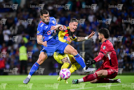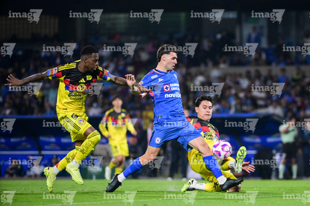Ciudad de México, 18 de octubre de 2025. Cristian Borja, Ramón Juárez y José Paradela, durante el partido correspondiente a la jornada 13 del torneo Apertura 2025 de la Liga BBVA MX, entre la Máquina Celeste del Cruz Azul y las Águilas del América, realizado en el estadio Olímpico Universitario. Foto: Imago7/ Alexis Chavez