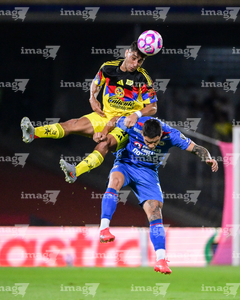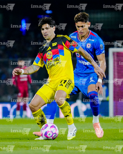 Ciudad de México, 18 de octubre de 2025. Erik Lira y Rodrigo Aguirre, durante el partido correspondiente a la jornada 13 del torneo Apertura 2025 de la Liga BBVA MX, entre la Máquina Celeste del Cruz Azul y las Águilas del América, realizado en el estadio Olímpico Universitario. Foto: Imago7/Diego Padilla