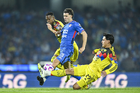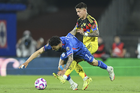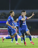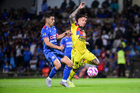 Ciudad de México, 18 de octubre de 2025. Brian Rodríguez y Erik Lira, durante el partido correspondiente a la jornada 13 del torneo Apertura 2025 de la Liga BBVA MX, entre la Máquina Celeste del Cruz Azul y las Águilas del América, realizado en el estadio Olímpico Universitario. Foto: Imago7/ Alexis Chavez