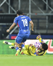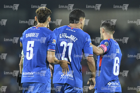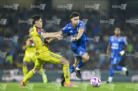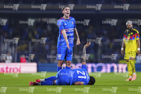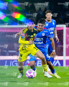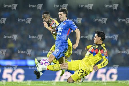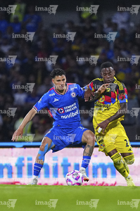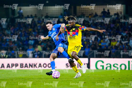 Ciudad de México, 18 de octubre de 2025. Amaury García y Alan Cervantes, durante el partido correspondiente a la jornada 13 del torneo Apertura 2025 de la Liga BBVA MX, entre la Máquina Celeste del Cruz Azul y las Águilas del América, realizado en el estadio Olímpico Universitario. Foto: Imago7/ Alexis Chavez