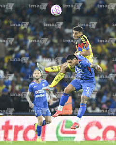 Ciudad de México, 18 de octubre de 2025. Erik Lira y Brian Rodríguez, durante el partido correspondiente a la jornada 13 del torneo Apertura 2025 de la Liga BBVA MX, entre la Máquina Celeste del Cruz Azul y las Águilas del América, realizado en el estadio Olímpico Universitario. Foto: Imago7/ Alexis Chavez