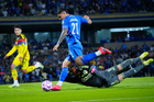 Ciudad de México, 18 de octubre de 2025. Gabriel Fernández "Toro" anota gol, durante el partido correspondiente a la jornada 13 del torneo Apertura 2025 de la Liga BBVA MX, entre la Máquina Celeste del Cruz Azul y las Águilas del América, realizado en el estadio Olímpico Universitario. Foto: Imago7/Diego Padilla