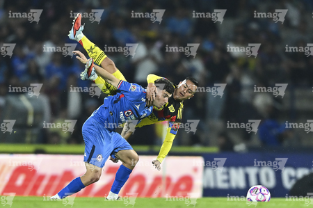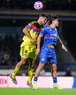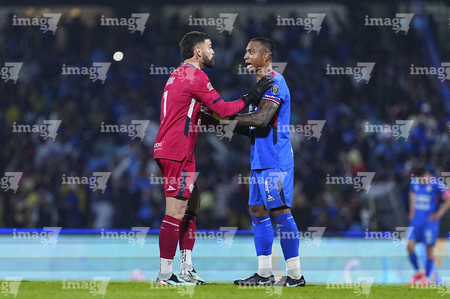 Ciudad de México, 18 de octubre de 2025. Andrés Gudiño y Willer Ditta, durante el partido correspondiente a la jornada 13 del torneo Apertura 2025 de la Liga BBVA MX, entre la Máquina Celeste del Cruz Azul y las Águilas del América, realizado en el estadio Olímpico Universitario. Foto: Imago7/ Manlio Contreras