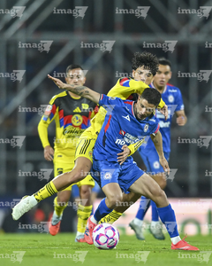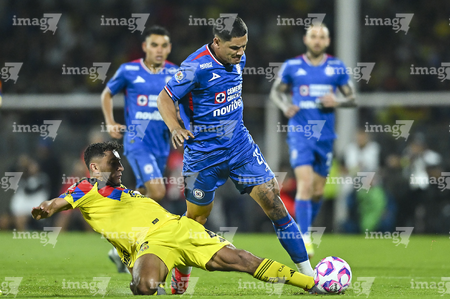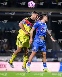 Ciudad de México, 18 de octubre de 2025. Sebastián Cáceres y Gabriel Fernández "Toro", durante el partido correspondiente a la jornada 13 del torneo Apertura 2025 de la Liga BBVA MX, entre la Máquina Celeste del Cruz Azul y las Águilas del América, realizado en el estadio Olímpico Universitario. Foto: Imago7/ Etzel Espinosa