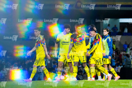 Ciudad de México, 18 de octubre de 2025. Jugadores del America, durante el partido correspondiente a la jornada 13 del torneo Apertura 2025 de la Liga BBVA MX, entre la Máquina Celeste del Cruz Azul y las Águilas del América, realizado en el estadio Olímpico Universitario. Foto: Imago7/ Manlio Contreras