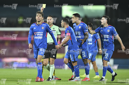Ciudad de México, 18 de octubre de 2025. Jesús Rafael López, árbitro central muestra tarjeta amarilla de amonestación a Jorge Rodarte, durante el partido correspondiente a la jornada 13 del torneo Apertura 2025 de la Liga BBVA MX, entre la Máquina Celeste del Cruz Azul y las Águilas del América, realizado en el estadio Olímpico Universitario. Foto: Imago7/ Etzel Espinosa