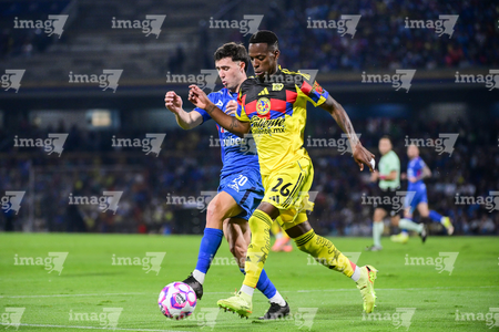 Ciudad de México, 18 de octubre de 2025. Kevin Álvarez y José Ignacio Rivero, durante el partido correspondiente a la jornada 13 del torneo Apertura 2025 de la Liga BBVA MX, entre la Máquina Celeste del Cruz Azul y las Águilas del América, realizado en el estadio Olímpico Universitario. Foto: Imago7/ Etzel Espinosa