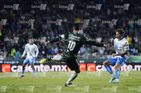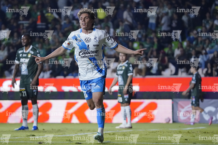 León, Guanajuato, 8 de noviembre de 2025. Alejandro Organista anota gol, durante el partido correspondiente a la jornada 17 del torneo Apertura 2025 de la Liga BBVA MX, entre los Esmeraldas del León y el Club Puebla, realizado en el estadio León. Foto: Imago7/ Sebastian Laureano Miranda