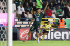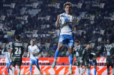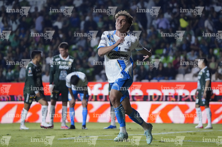 León, Guanajuato, 8 de noviembre de 2025. Emiliano Gómez anota gol, durante el partido correspondiente a la jornada 17 del torneo Apertura 2025 de la Liga BBVA MX, entre los Esmeraldas del León y el Club Puebla, realizado en el estadio León. Foto: Imago7/ Sebastian Laureano Miranda