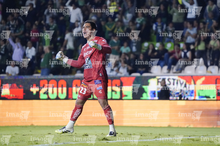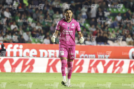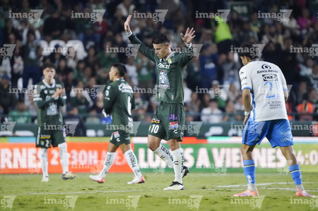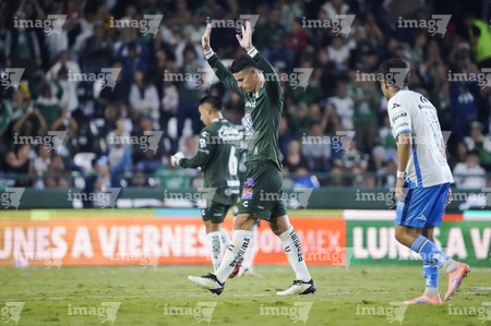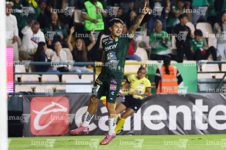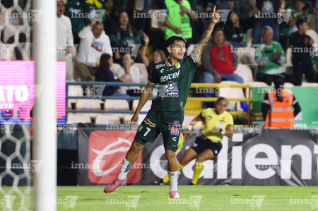 León, Guanajuato, 8 de noviembre de 2025. Alejandro Organista en festejo de gol, durante el partido correspondiente a la jornada 17 del torneo Apertura 2025 de la Liga BBVA MX, entre los Esmeraldas del León y el Club Puebla, realizado en el estadio León. Foto: Imago7/ Sebastian Laureano Miranda