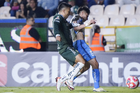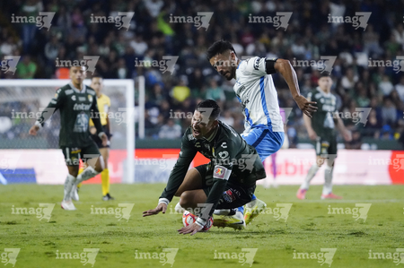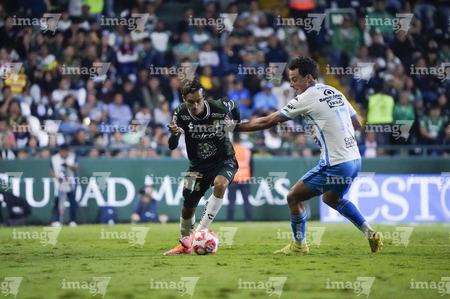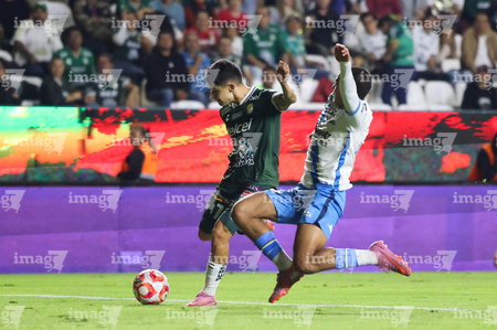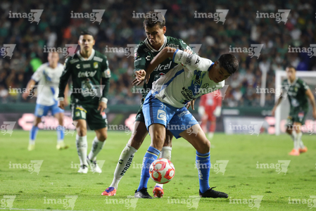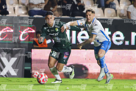 León, Guanajuato, 8 de noviembre de 2025. Emiliano Gómez y José David Ramírez "El Avión", durante el partido correspondiente a la jornada 17 del torneo Apertura 2025 de la Liga BBVA MX, entre los Esmeraldas del León y el Club Puebla, realizado en el estadio León. Foto: Imago7/ Sebastian Laureano Miranda