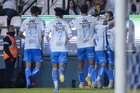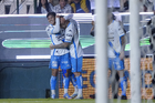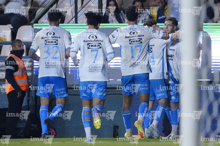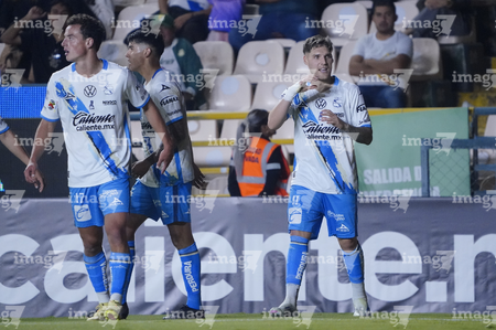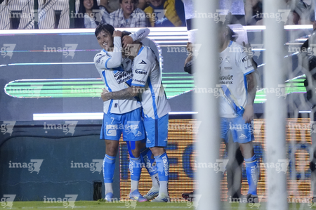 León, Guanajuato, 8 de noviembre de 2025. Jugadores del Club Puebla en festejo de gol, durante el partido correspondiente a la jornada 17 del torneo Apertura 2025 de la Liga BBVA MX, entre los Esmeraldas del León y el Club Puebla, realizado en el estadio León. Foto: Imago7/ Sebastian Laureano Miranda