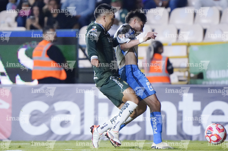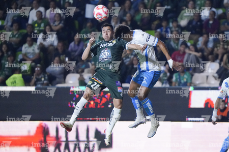 León, Guanajuato, 8 de noviembre de 2025. Nicolás Díaz y Jordi Cortizo, durante el partido correspondiente a la jornada 17 del torneo Apertura 2025 de la Liga BBVA MX, entre los Esmeraldas del León y el Club Puebla, realizado en el estadio León. Foto: Imago7/ Sebastian Laureano Miranda