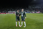 León, Guanajuato, 8 de noviembre de 2025. James Rodríguez y Nicolás Díaz, durante el partido correspondiente a la jornada 17 del torneo Apertura 2025 de la Liga BBVA MX, entre los Esmeraldas del León y el Club Puebla, realizado en el estadio León. Foto: Imago7/ Sebastian Laureano Miranda