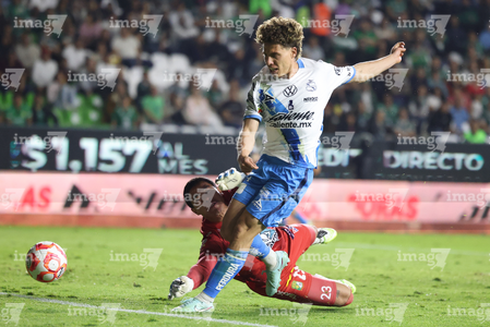 León, Guanajuato, 8 de noviembre de 2025. Rodrigo Echeverría (I), durante el partido correspondiente a la jornada 17 del torneo Apertura 2025 de la Liga BBVA MX, entre los Esmeraldas del León y el Club Puebla, realizado en el estadio León. Foto: Imago7/ Sebastian Laureano Miranda