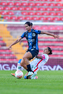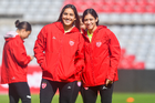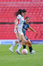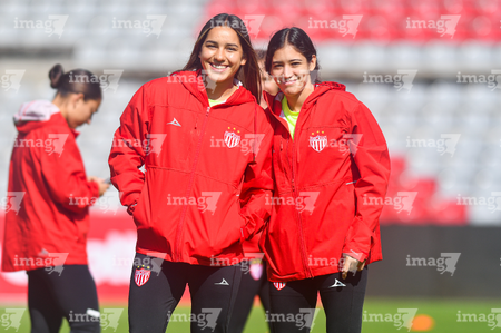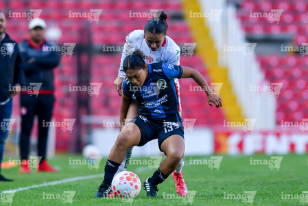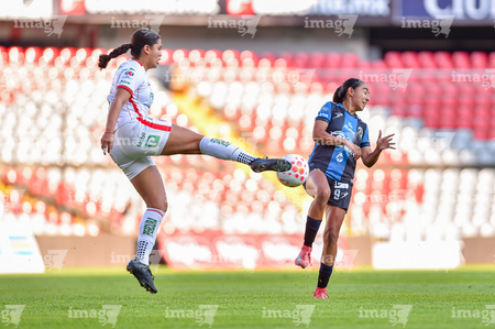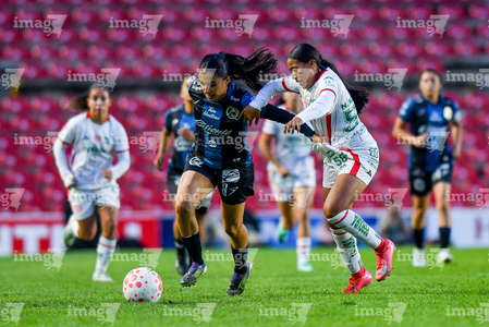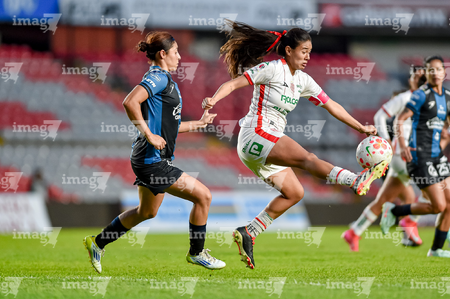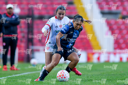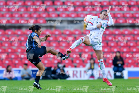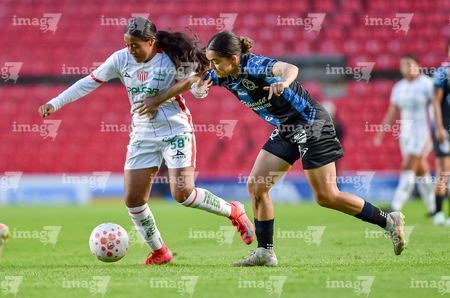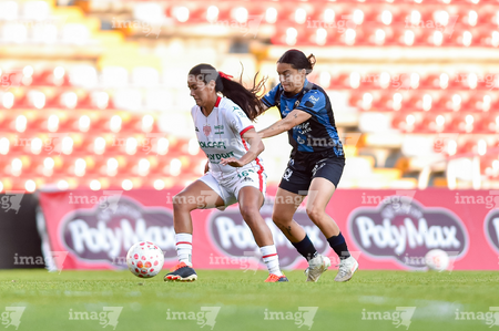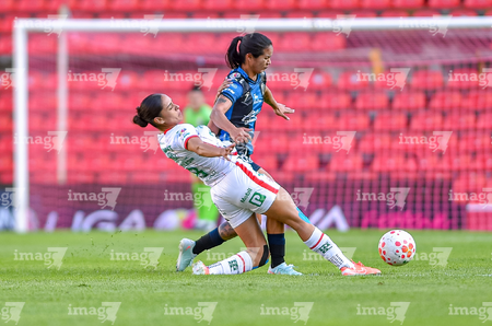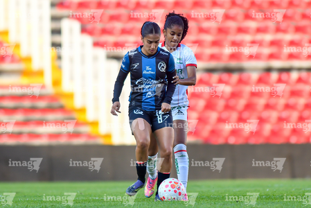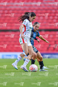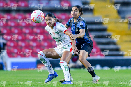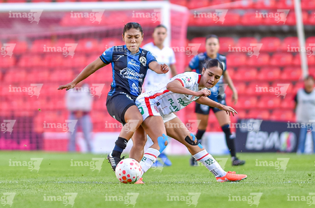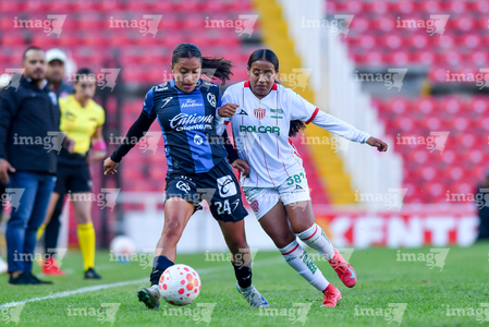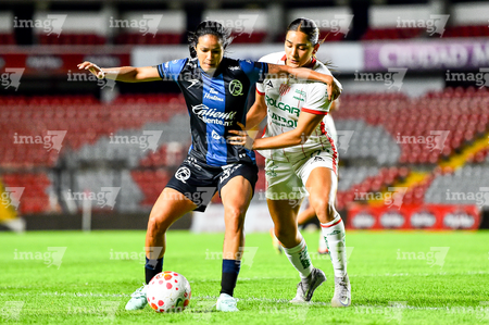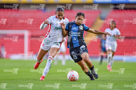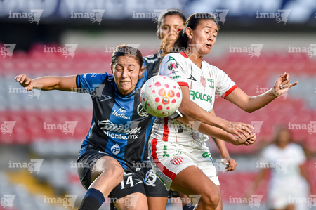 Querétaro, Querétaro, 3 de octubre de 2025. Emily Flores y Ahtziri Méndez, durante el partido correspondiente a la jornada 14 del torneo Apertura 2025 de la Liga BBVA MX Femenil, entre el Club Querétaro y las Centellas del Necaxa, realizado en La Corregidora. Foto: Imago7/ Hugo Martinez