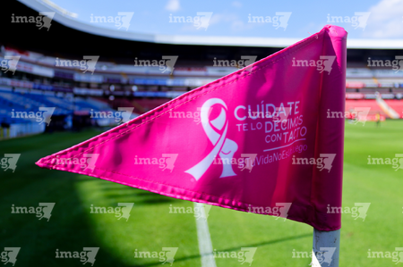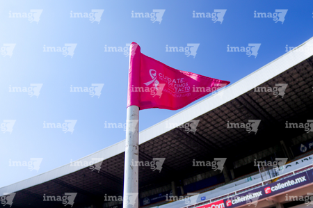 Querétaro, Querétaro, 3 de octubre de 2025. Banderin de tiro de esquina de la Campaña Rosa para la concientización del Cáncer de Mama, durante el partido correspondiente a la jornada 14 del torneo Apertura 2025 de la Liga BBVA MX Femenil, entre el Club Querétaro y las Centellas del Necaxa, realizado en La Corregidora. Foto: Imago7/ Hugo Martinez
