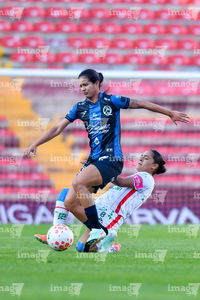 Querétaro, Querétaro, 3 de octubre de 2025. Corina Gómez y Lady Andrade, durante el partido correspondiente a la jornada 14 del torneo Apertura 2025 de la Liga BBVA MX Femenil, entre el Club Querétaro y las Centellas del Necaxa, realizado en La Corregidora. Foto: Imago7/ Hugo Martinez