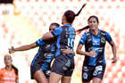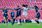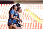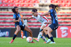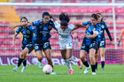 Querétaro, Querétaro, 3 de octubre de 2025. Lady Andrade, Winibian Peralta y Vanessa Gonzalez, durante el partido correspondiente a la jornada 14 del torneo Apertura 2025 de la Liga BBVA MX Femenil, entre el Club Querétaro y las Centellas del Necaxa, realizado en La Corregidora. Foto: Imago7/