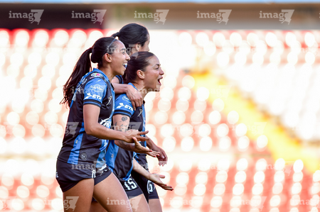Querétaro, Querétaro, 3 de octubre de 2025. Victoria Ceceña, Karen de León y Lady Andrade, durante el partido correspondiente a la jornada 14 del torneo Apertura 2025 de la Liga BBVA MX Femenil, entre el Club Querétaro y las Centellas del Necaxa, realizado en La Corregidora. Foto: Imago7/