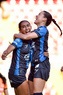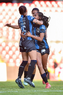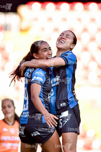 Querétaro, Querétaro, 3 de octubre de 2025. Victoria Ceceña y Yadira Toraya en festejo de gol, durante el partido correspondiente a la jornada 14 del torneo Apertura 2025 de la Liga BBVA MX Femenil, entre el Club Querétaro y las Centellas del Necaxa, realizado en La Corregidora. Foto: Imago7/ Hugo Martinez