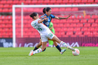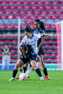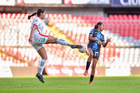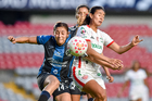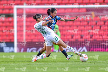 Querétaro, Querétaro, 3 de octubre de 2025. Karen de León y Lady Andrade, durante el partido correspondiente a la jornada 14 del torneo Apertura 2025 de la Liga BBVA MX Femenil, entre el Club Querétaro y las Centellas del Necaxa, realizado en La Corregidora. Foto: Imago7/ Hugo Martinez