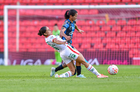 Querétaro, Querétaro, 3 de octubre de 2025. Vanessa González y Samantha Calvillo, durante el partido correspondiente a la jornada 14 del torneo Apertura 2025 de la Liga BBVA MX Femenil, entre el Club Querétaro y las Centellas del Necaxa, realizado en La Corregidora. Foto: Imago7/ Hugo Martinez