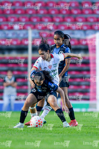 Querétaro, Querétaro, 3 de octubre de 2025. Lady Andrade y Karen de León, durante el partido correspondiente a la jornada 14 del torneo Apertura 2025 de la Liga BBVA MX Femenil, entre el Club Querétaro y las Centellas del Necaxa, realizado en La Corregidora. Foto: Imago7/