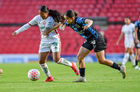 Querétaro, Querétaro, 3 de octubre de 2025. Lía Morán y Nataly Roque, durante el partido correspondiente a la jornada 14 del torneo Apertura 2025 de la Liga BBVA MX Femenil, entre el Club Querétaro y las Centellas del Necaxa, realizado en La Corregidora. Foto: Imago7/