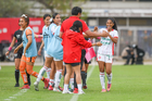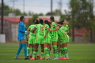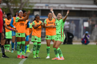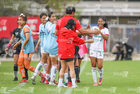 Ciudad Juárez, Chihuahua, 11 de octubre de 2025. Jugadoras de FC Juárez, durante el partido correspondiente a la jornada 15 del torneo Apertura 2025 de la Liga BBVA MX Femenil, entre las Bravas de FC Juárez y las Centellas del Necaxa, realizado en realizado en el Instituto Tecnológico de Ciudad Juárez. Foto: Imago7/ José Zamora