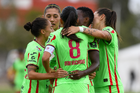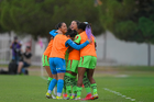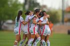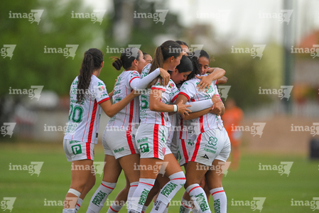 Ciudad Juárez, Chihuahua, 11 de octubre de 2025. Jugadoras de FC Juárez Femenil en festejo de gol, durante el partido correspondiente a la jornada 15 del torneo Apertura 2025 de la Liga BBVA MX Femenil, entre las Bravas de FC Juárez y las Centellas del Necaxa, realizado en realizado en el Instituto Tecnológico de Ciudad Juárez. Foto: Imago7/ Alejandro Rodríguez