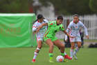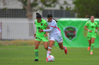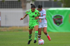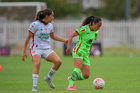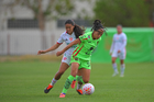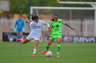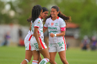Ciudad Juárez, Chihuahua, 11 de octubre de 2025. Nataly Roque y Avril Navarro, durante el partido correspondiente a la jornada 15 del torneo Apertura 2025 de la Liga BBVA MX Femenil, entre las Bravas de FC Juárez y las Centellas del Necaxa, realizado en realizado en el Instituto Tecnológico de Ciudad Juárez. Foto: Imago7/ Alejandro Rodríguez