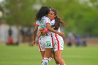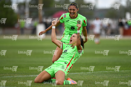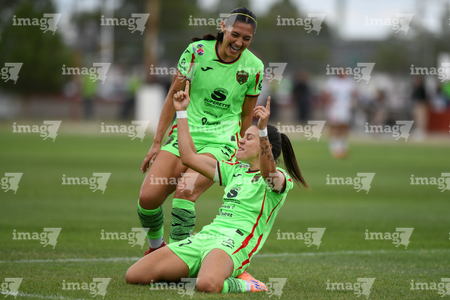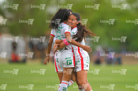 Ciudad Juárez, Chihuahua, 11 de octubre de 2025. Norma Palafox y Bianca Mora en festejo de gol, durante el partido correspondiente a la jornada 15 del torneo Apertura 2025 de la Liga BBVA MX Femenil, entre las Bravas de FC Juárez y las Centellas del Necaxa, realizado en realizado en el Instituto Tecnológico de Ciudad Juárez. Foto: Imago7/ Alejandro Rodríguez