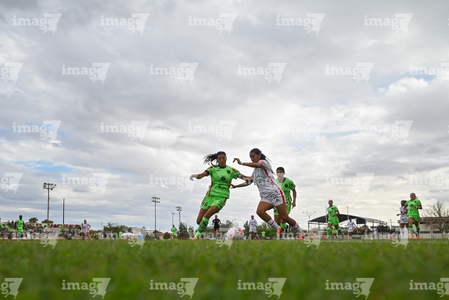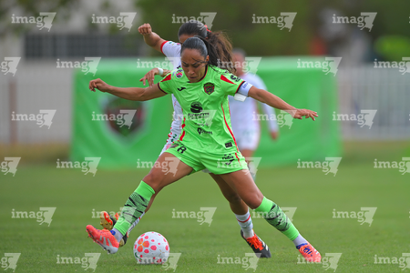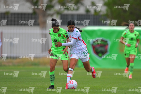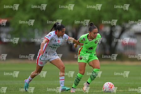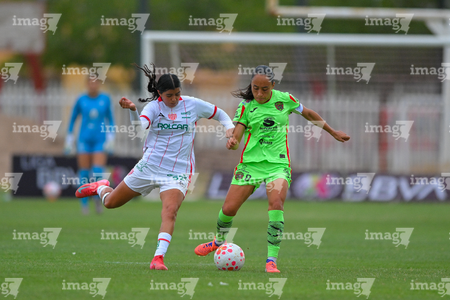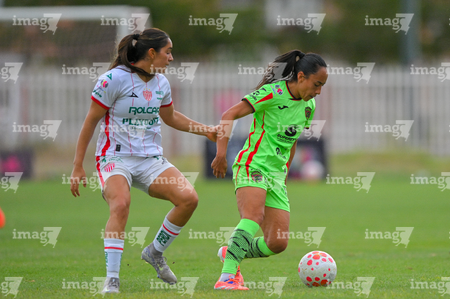 Ciudad Juárez, Chihuahua, 11 de octubre de 2025. Mar Moya y Alexia García, durante el partido correspondiente a la jornada 15 del torneo Apertura 2025 de la Liga BBVA MX Femenil, entre las Bravas de FC Juárez y las Centellas del Necaxa, realizado en realizado en el Instituto Tecnológico de Ciudad Juárez. Foto: Imago7/ Alejandro Rodríguez