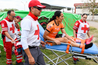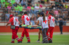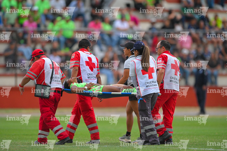 Ciudad Juárez, Chihuahua, 11 de octubre de 2025. Jennifer Amaro siendo trasladada en camilla, durante el partido correspondiente a la jornada 15 del torneo Apertura 2025 de la Liga BBVA MX Femenil, entre las Bravas de FC Juárez y las Centellas del Necaxa, realizado en realizado en el Instituto Tecnológico de Ciudad Juárez. Foto: Imago7/ Alejandro Rodríguez