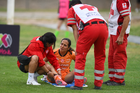 Ciudad Juárez, Chihuahua, 11 de octubre de 2025. Jennifer Amaro siendo atendida despues de una lesión, durante el partido correspondiente a la jornada 15 del torneo Apertura 2025 de la Liga BBVA MX Femenil, entre las Bravas de FC Juárez y las Centellas del Necaxa, realizado en realizado en el Instituto Tecnológico de Ciudad Juárez. Foto: Imago7/ Alejandro Rodríguez