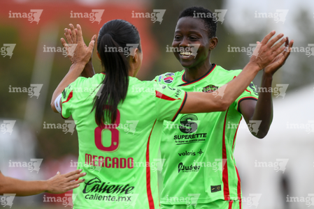Ciudad Juárez, Chihuahua, 11 de octubre de 2025. Liliana Mercado y Julitha Singano en festejo de gol, durante el partido correspondiente a la jornada 15 del torneo Apertura 2025 de la Liga BBVA MX Femenil, entre las Bravas de FC Juárez y las Centellas del Necaxa, realizado en realizado en el Instituto Tecnológico de Ciudad Juárez. Foto: Imago7/ Alejandro Rodríguez