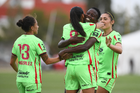 Ciudad Juárez, Chihuahua, 11 de octubre de 2025. Julitha Singano y Liliana Mercado en festejo de gol, durante el partido correspondiente a la jornada 15 del torneo Apertura 2025 de la Liga BBVA MX Femenil, entre las Bravas de FC Juárez y las Centellas del Necaxa, realizado en realizado en el Instituto Tecnológico de Ciudad Juárez. Foto: Imago7/ Alejandro Rodríguez