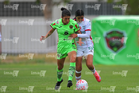 Ciudad Juárez, Chihuahua, 11 de octubre de 2025. Eva González y Ahtziri Méndez, durante el partido correspondiente a la jornada 15 del torneo Apertura 2025 de la Liga BBVA MX Femenil, entre las Bravas de FC Juárez y las Centellas del Necaxa, realizado en realizado en el Instituto Tecnológico de Ciudad Juárez. Foto: Imago7/ José Zamora