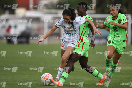 Ciudad Juárez, Chihuahua, 11 de octubre de 2025. Ahtziri Méndez y Julitha Singano, durante el partido correspondiente a la jornada 15 del torneo Apertura 2025 de la Liga BBVA MX Femenil, entre las Bravas de FC Juárez y las Centellas del Necaxa, realizado en realizado en el Instituto Tecnológico de Ciudad Juárez. Foto: Imago7/ Alejandro Rodríguez