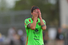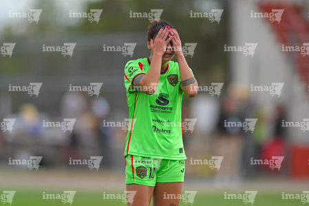 Ciudad Juárez, Chihuahua, 11 de octubre de 2025. Amanda Murillo en lamento , durante el partido correspondiente a la jornada 15 del torneo Apertura 2025 de la Liga BBVA MX Femenil, entre las Bravas de FC Juárez y las Centellas del Necaxa, realizado en realizado en el Instituto Tecnológico de Ciudad Juárez. Foto: Imago7/ Alejandro Rodríguez