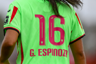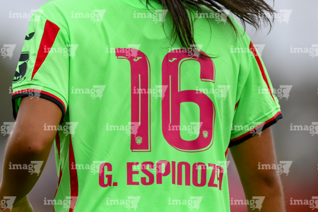 Ciudad Juárez, Chihuahua, 11 de octubre de 2025. Detalle de jersey de Giselle Espinoza durante la Campaña Rosa para la concientización del Cancer de Mama, durante el partido correspondiente a la jornada 15 del torneo Apertura 2025 de la Liga BBVA MX Femenil, entre las Bravas de FC Juárez y las Centellas del Necaxa, realizado en realizado en el Instituto Tecnológico de Ciudad Juárez. Foto: Imago7/ Alejandro Rodríguez