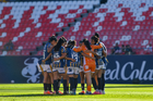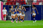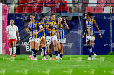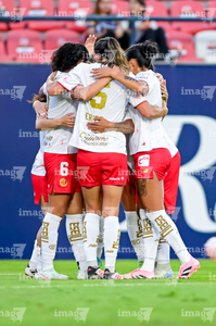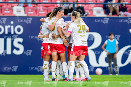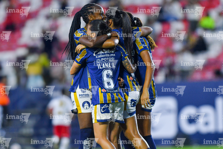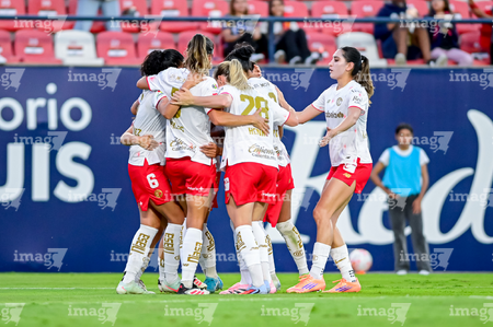 San Luis Potosí, San Luis Potosí, 12 de octubre de 2025. Jugadoras del Atlético de San Luis femenil en festejo de gol, durante el partido correspondiente a la jornada 15 del torneo Apertura 2025 de la Liga BBVA MX Femenil, entre el Atlético San Luis y las Diablas Rojas del Toluca, realizado en el estadio Alfonso Lastras. Foto: Imago7/ Olimpia Puga
