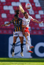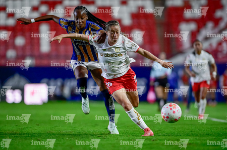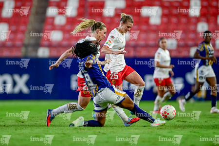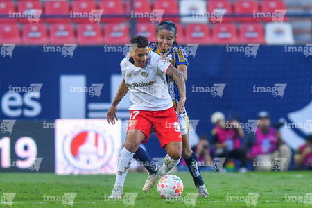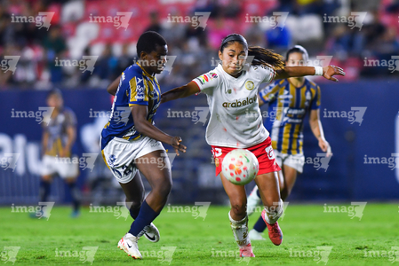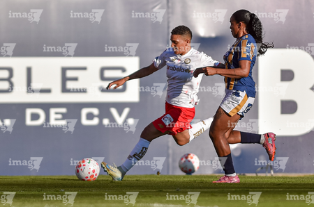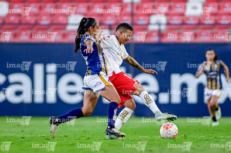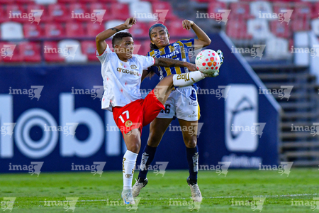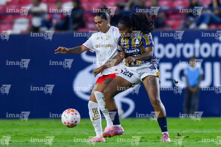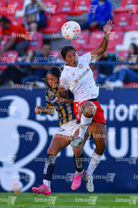San Luis Potosí, San Luis Potosí, 12 de octubre de 2025. Enyerliannys Higuera y Abby Erceg, durante el partido correspondiente a la jornada 15 del torneo Apertura 2025 de la Liga BBVA MX Femenil, entre el Atlético San Luis y las Diablas Rojas del Toluca, realizado en el estadio Alfonso Lastras. Foto: Imago7/ Hugo Martinez