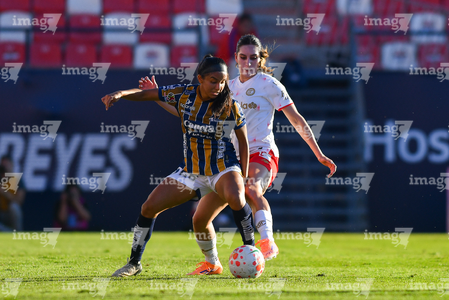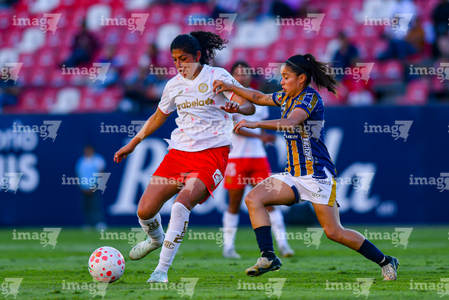 San Luis Potosí, San Luis Potosí, 12 de octubre de 2025. Ana Zárate y Elaily Hernández-Repreza, durante el partido correspondiente a la jornada 15 del torneo Apertura 2025 de la Liga BBVA MX Femenil, entre el Atlético San Luis y las Diablas Rojas del Toluca, realizado en el estadio Alfonso Lastras. Foto: Imago7/ Hugo Martinez