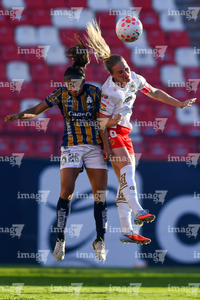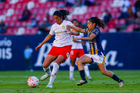 San Luis Potosí, San Luis Potosí, 12 de octubre de 2025. Abby Erceg y Rebeca Contreras, durante el partido correspondiente a la jornada 15 del torneo Apertura 2025 de la Liga BBVA MX Femenil, entre el Atlético San Luis y las Diablas Rojas del Toluca, realizado en el estadio Alfonso Lastras. Foto: Imago7/ Olimpia Puga