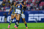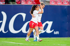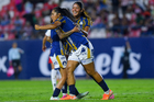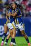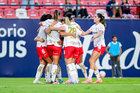 San Luis Potosí, San Luis Potosí, 12 de octubre de 2025. Cinthya Peraza y Faustine Robert en festejo de gol, durante el partido correspondiente a la jornada 15 del torneo Apertura 2025 de la Liga BBVA MX Femenil, entre el Atlético San Luis y las Diablas Rojas del Toluca, realizado en el estadio Alfonso Lastras. Foto: Imago7/ Hugo Martinez