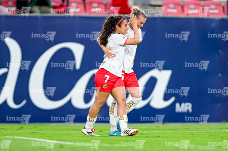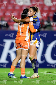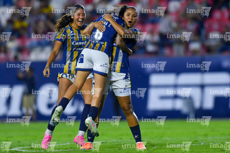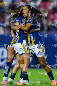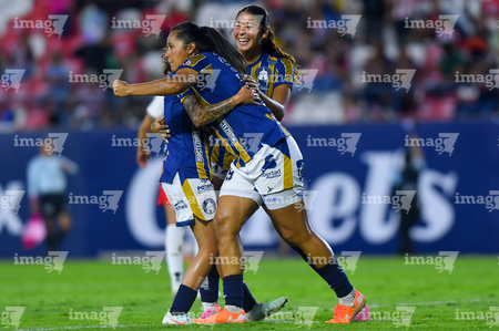 San Luis Potosí, San Luis Potosí, 12 de octubre de 2025. Ilana Izquierdo y Enyerliannys Higuera en festejo de gol, durante el partido correspondiente a la jornada 15 del torneo Apertura 2025 de la Liga BBVA MX Femenil, entre el Atlético San Luis y las Diablas Rojas del Toluca, realizado en el estadio Alfonso Lastras. Foto: Imago7/ Olimpia Puga